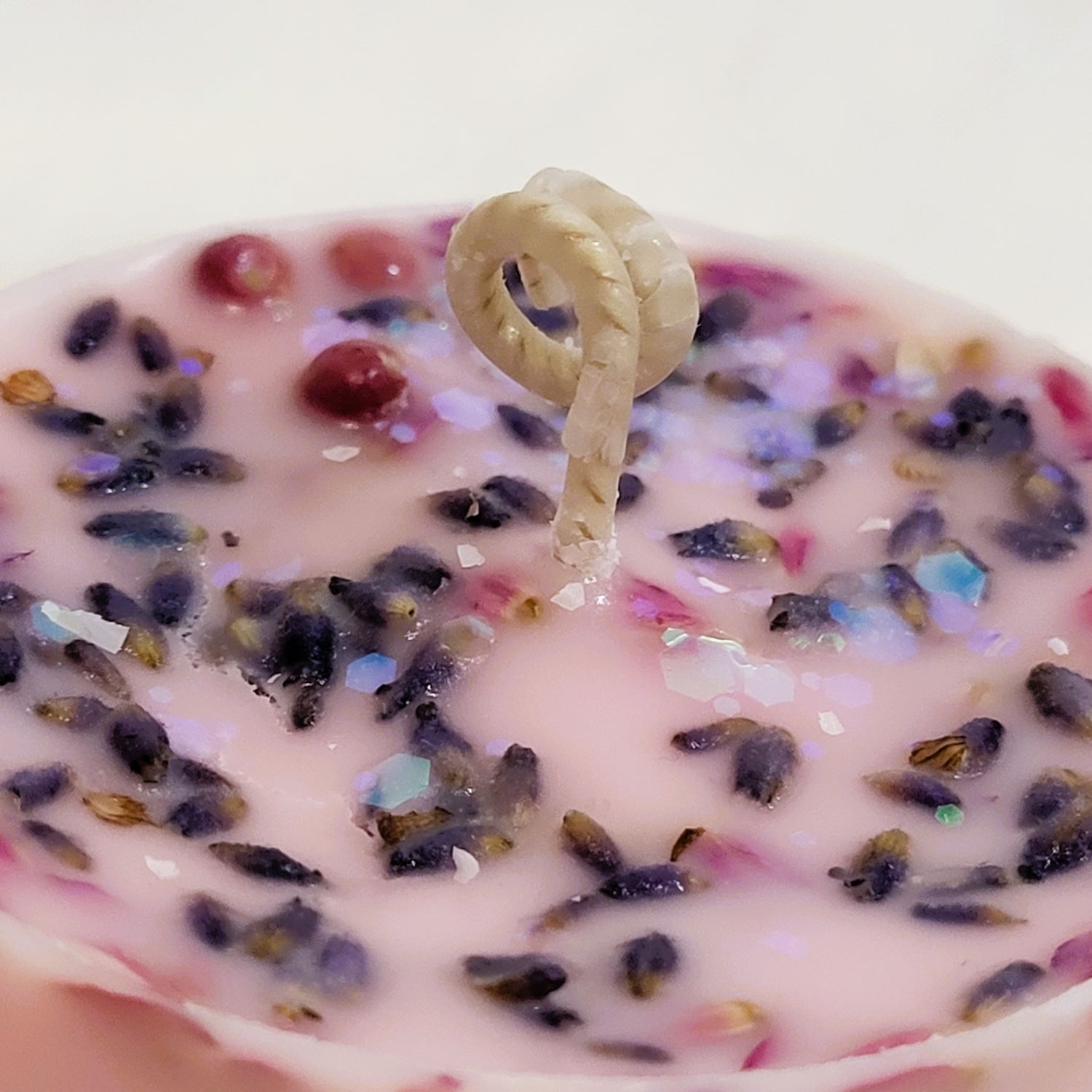 Cutia conține o lumânare handmade din ceară de soia, cu flori de lavandă și hortensie și arome de vanilie și iasomie - greutate, 175 g, precum și o amuletă florală parfumată - greutate, 19-11 g.