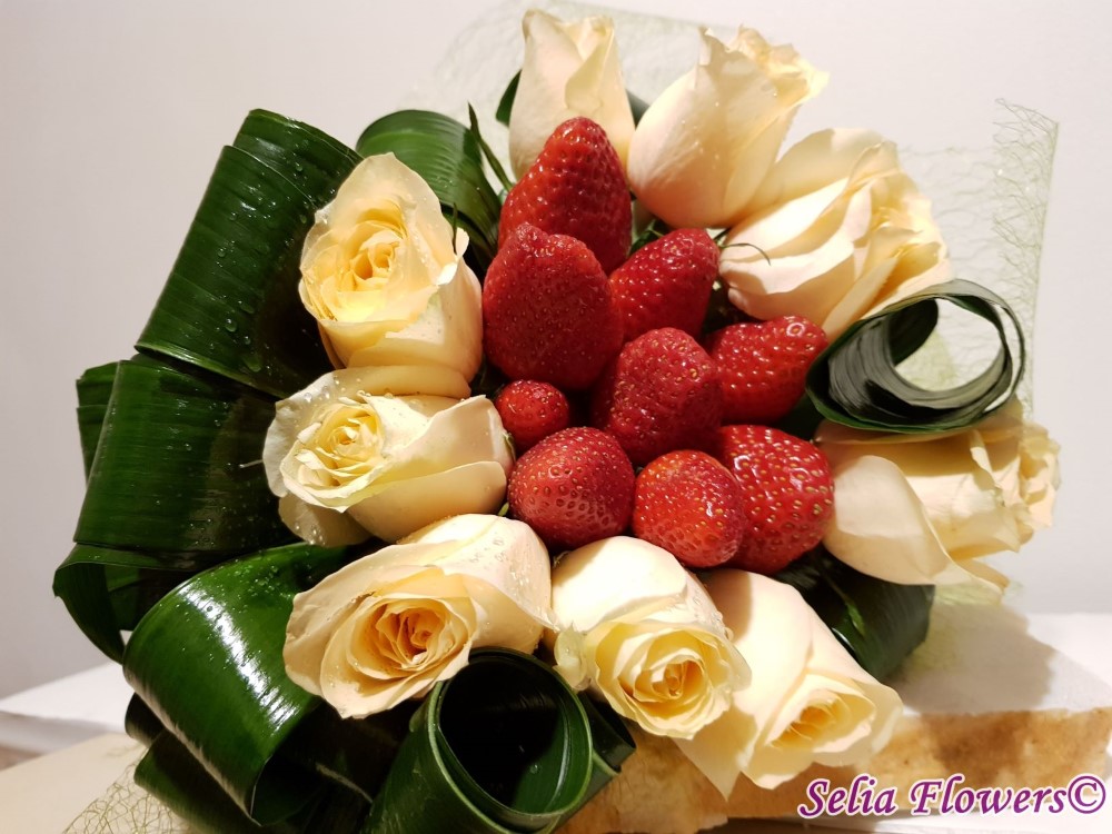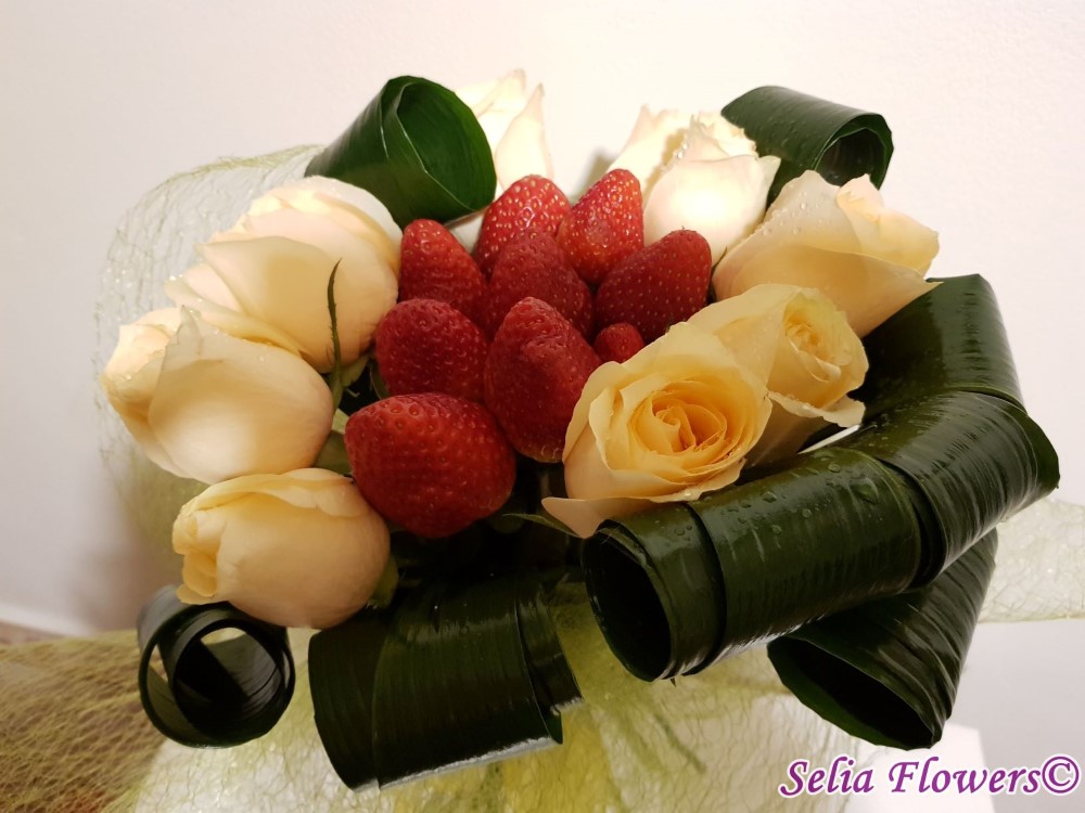 Daca vrei sa o surprinzi si sa o si rasfeti in acelasi timp, ai gasit buchetul perfect, realizat din 9 trandafiri, capsuni proaspete, aspidistra si accesorii.