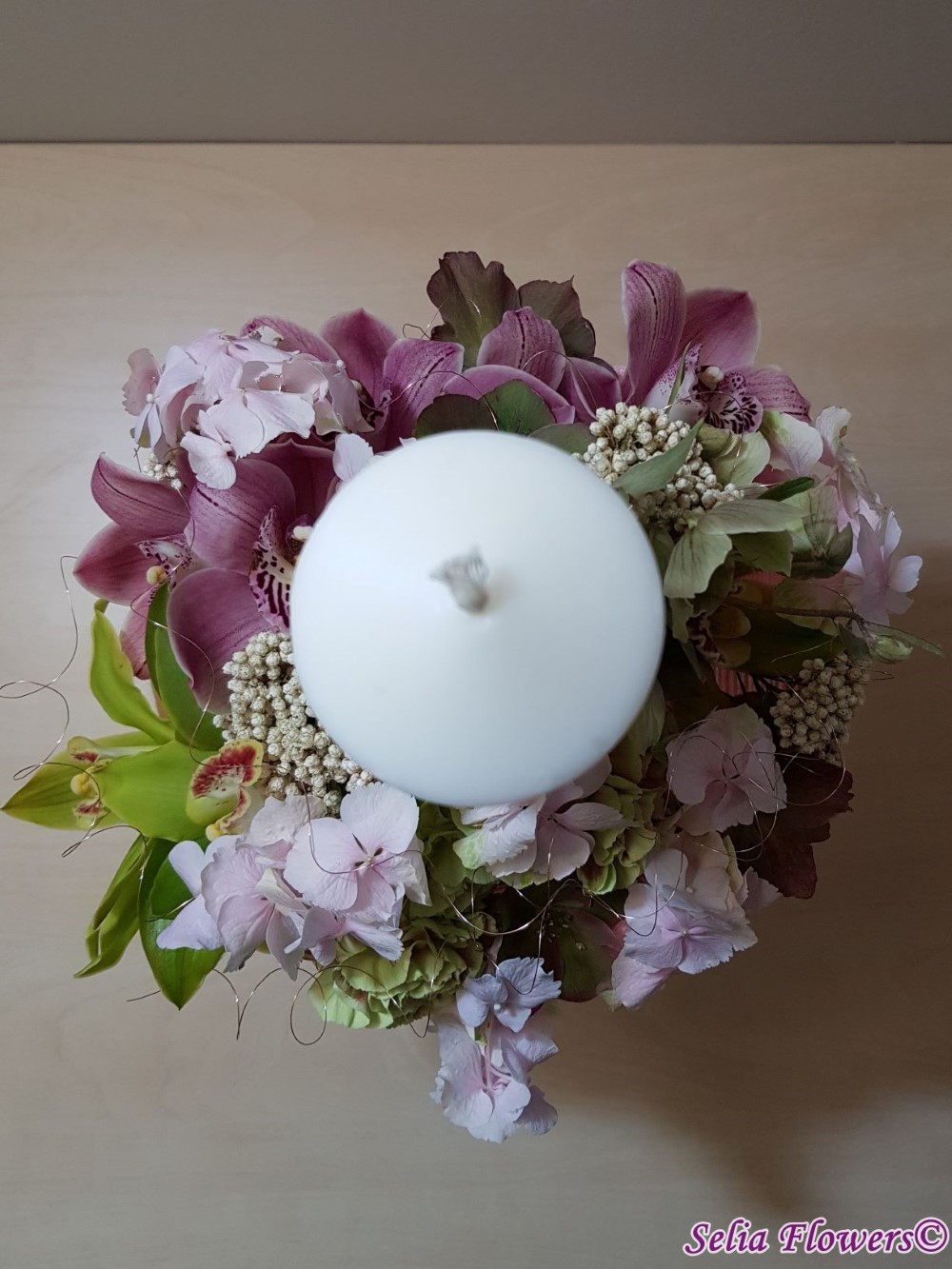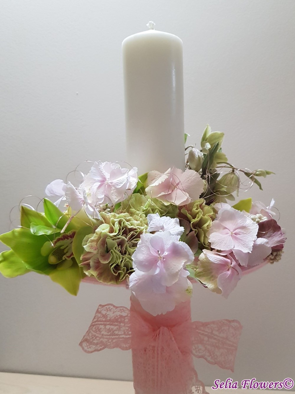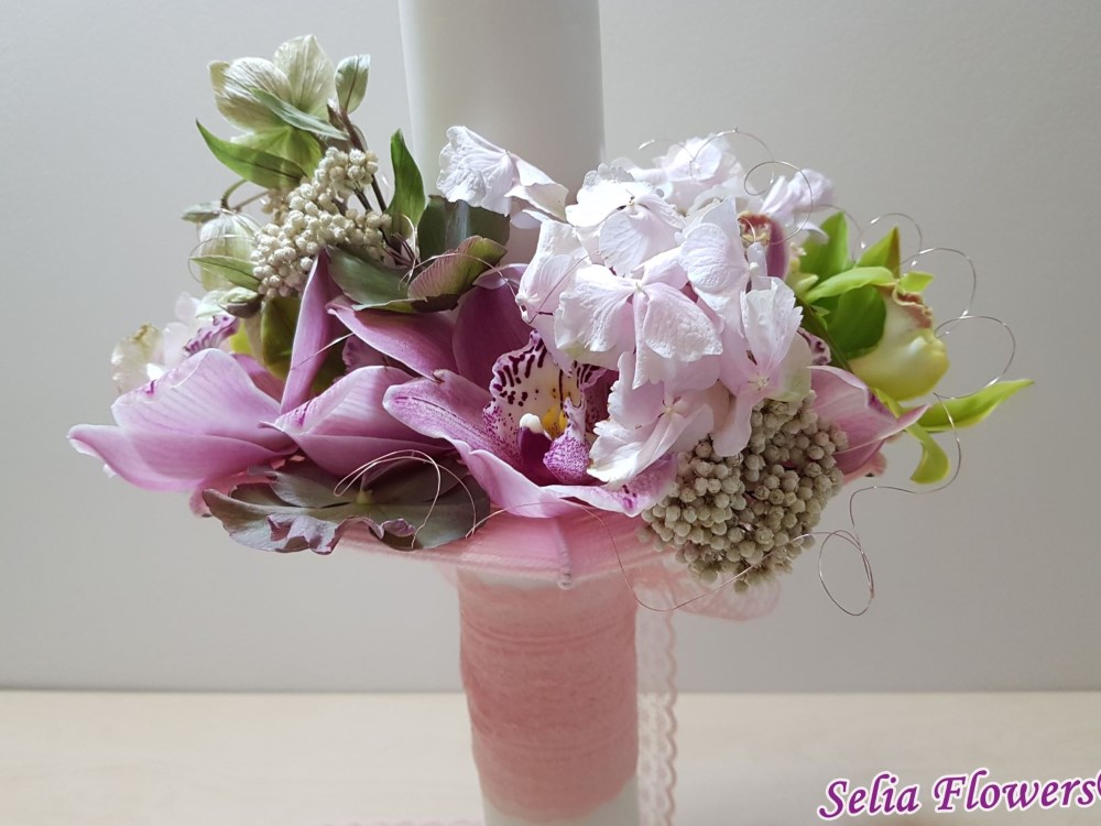Lumanare decorata cu flori naturale cu un design realizat pe structura spider lucrata manual in atelierul nostru,