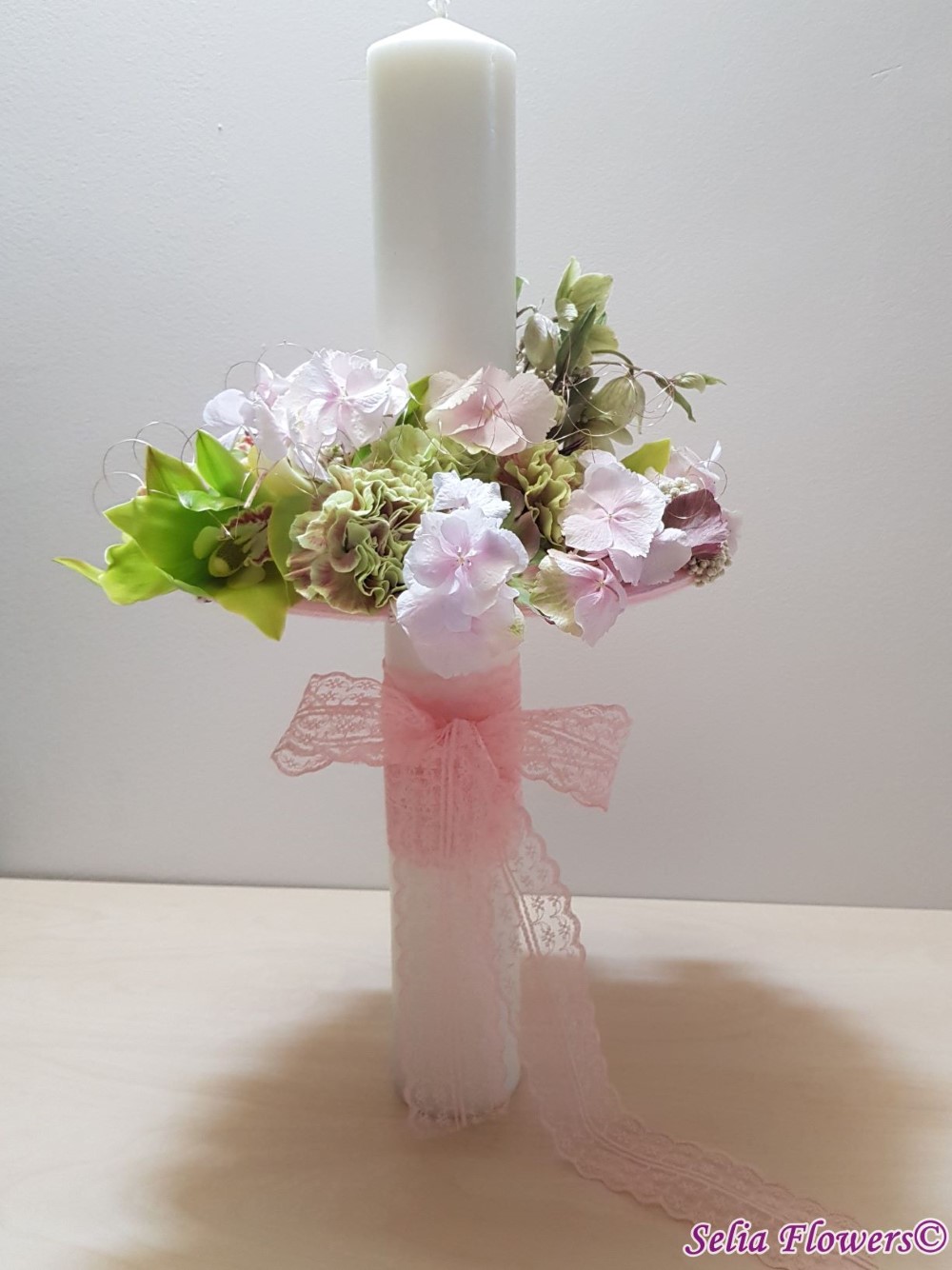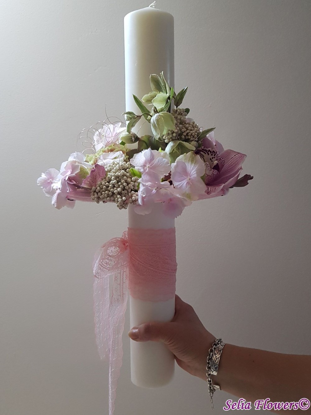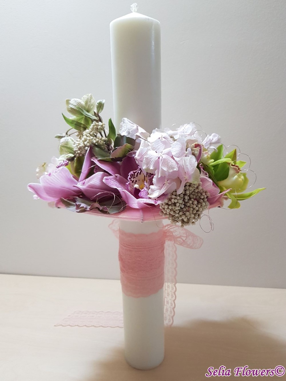 Lumanare decorata cu flori naturale cu un design realizat pe structura spider lucrata manual in atelierul nostru,
