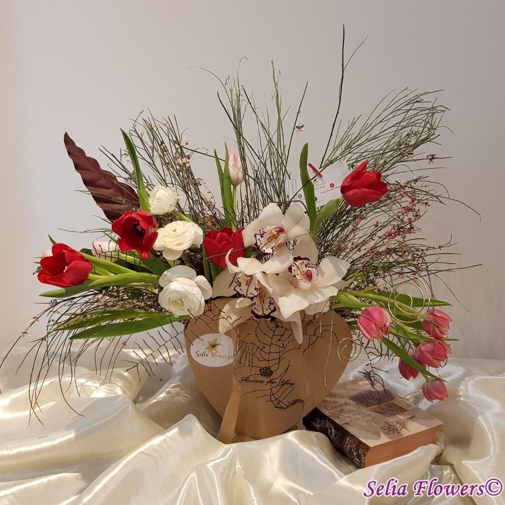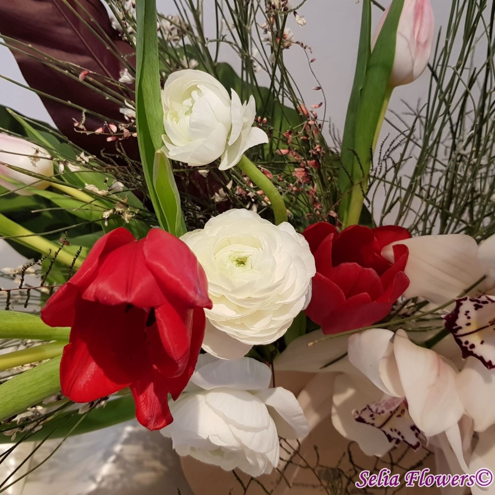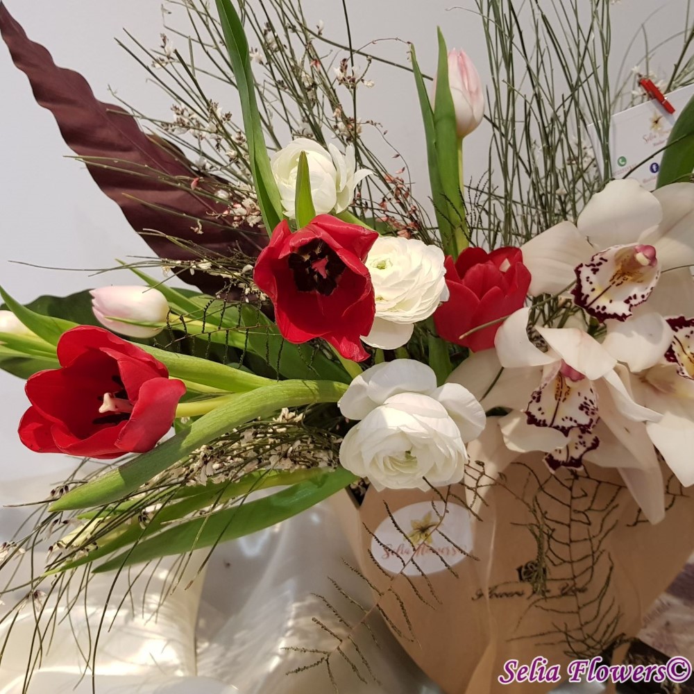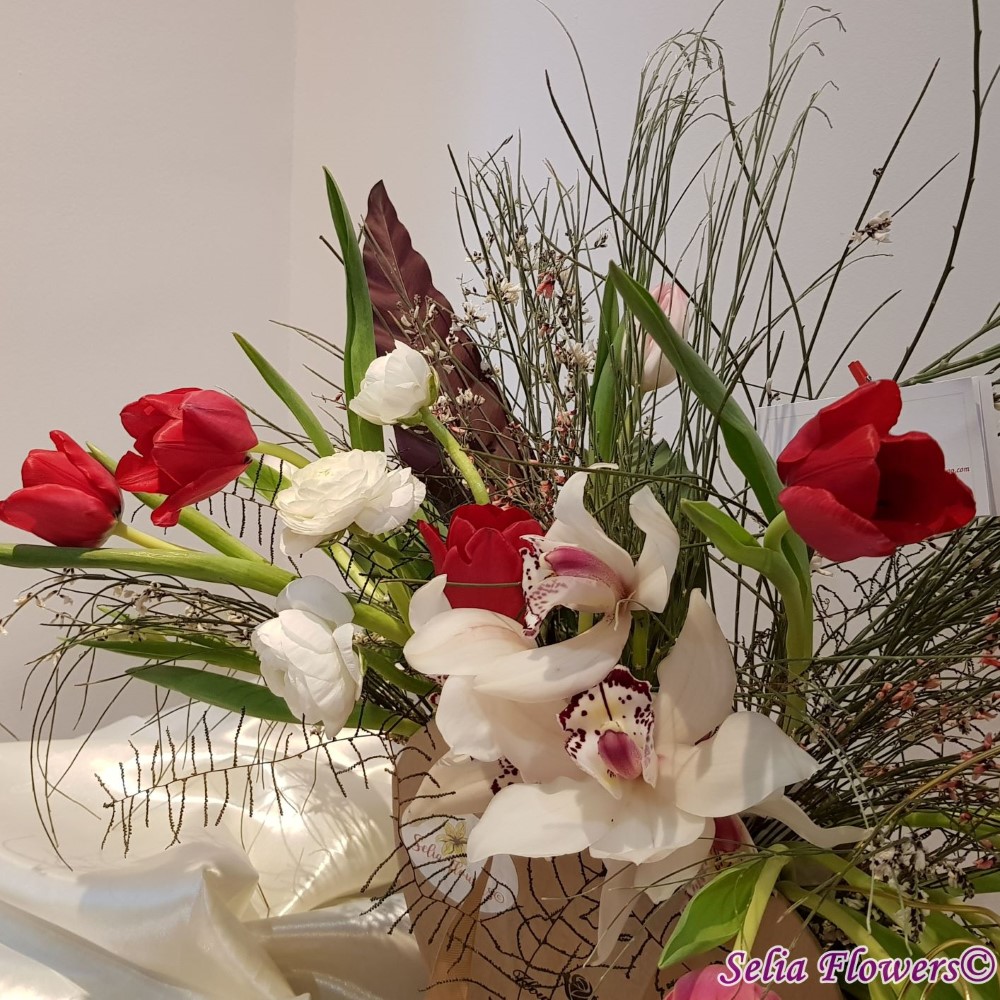 Compozitie: orhidee cymbidium, lalele in doua culori, ranunculus, ginster in 2 culori, verdeata, accesorii din sarma floristica.