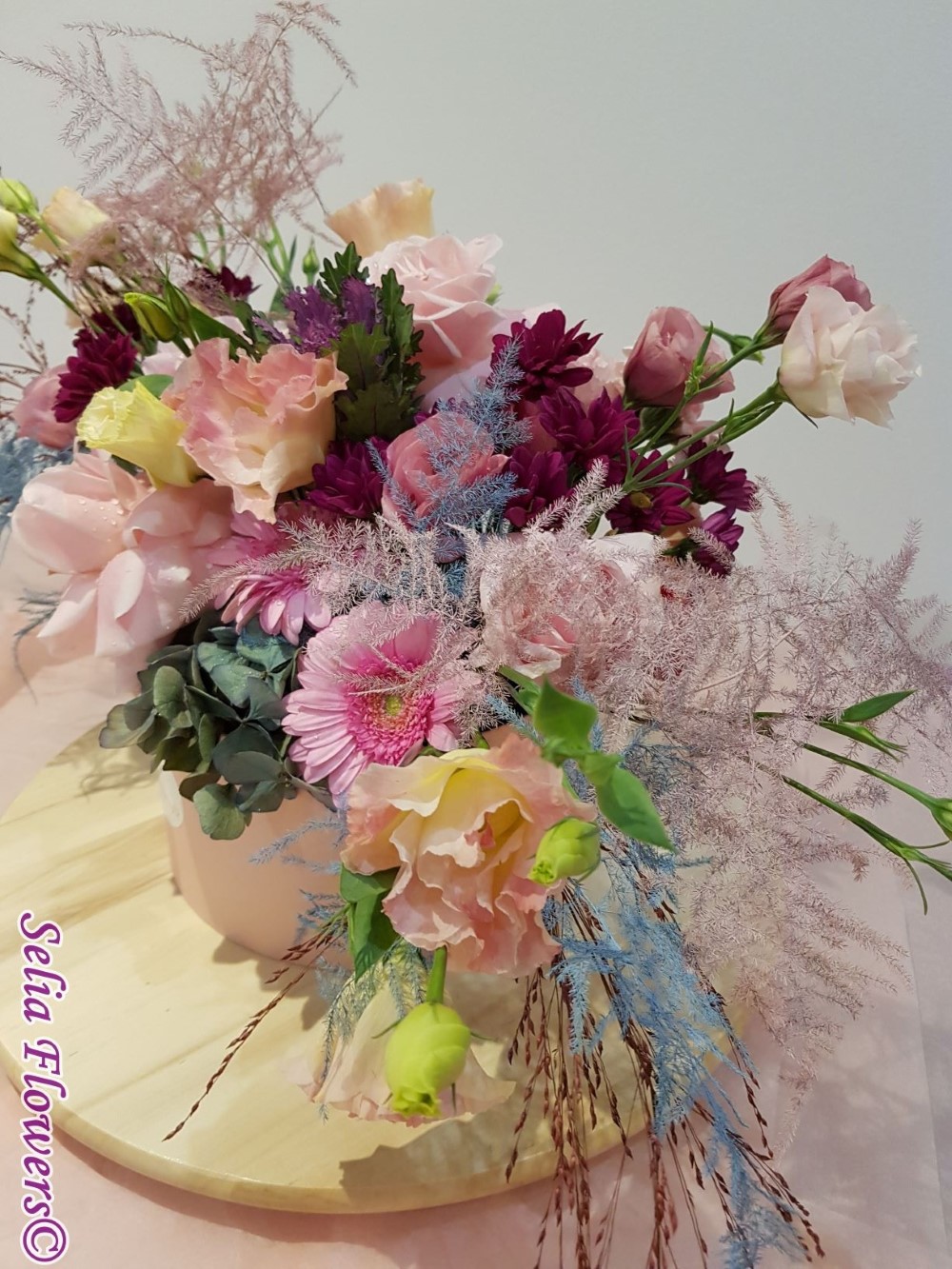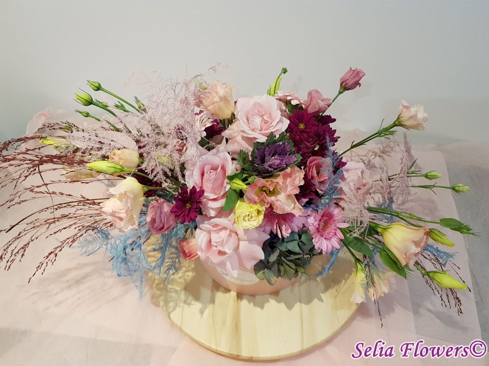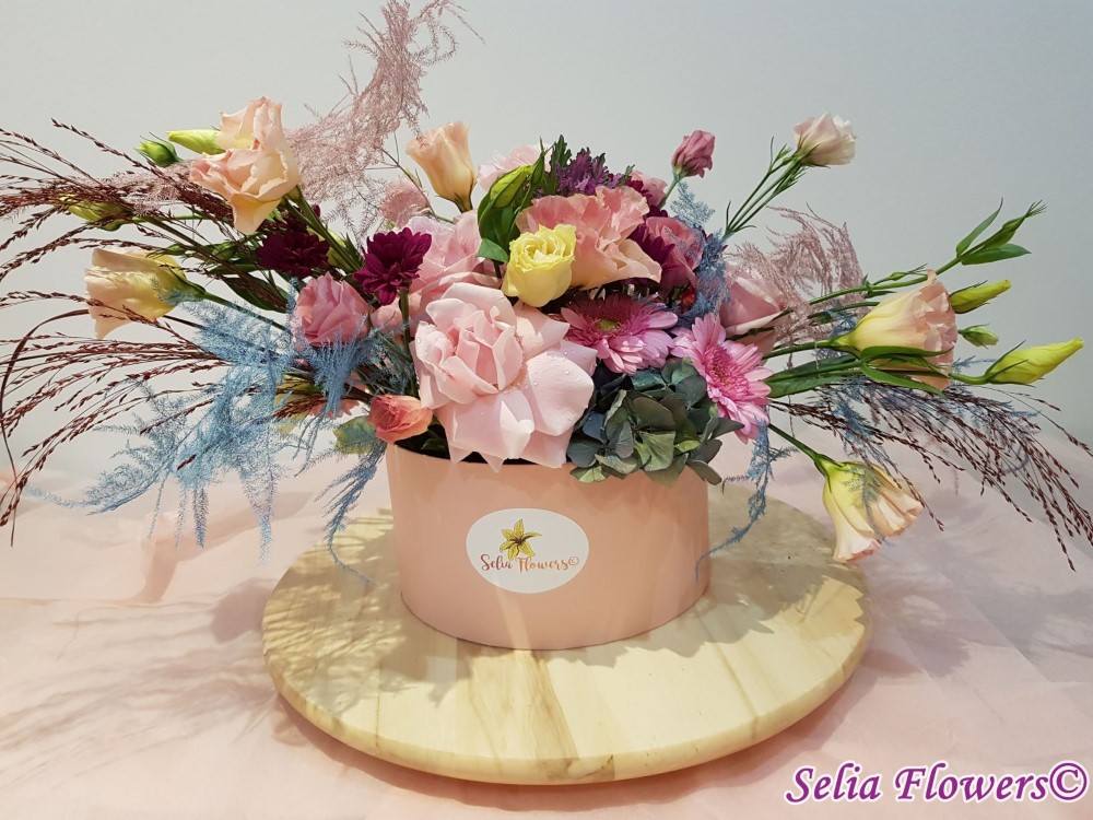 Aranjament in cutie, construit in suport de burete umed, cu trandafiri, lisianthus, germini, minicrizantema, asparagus, panicum vopsit, hydrangea uscata, brassica.