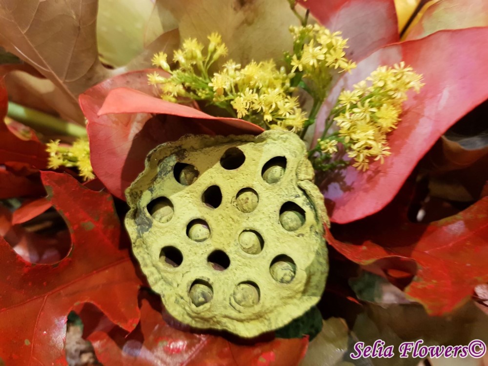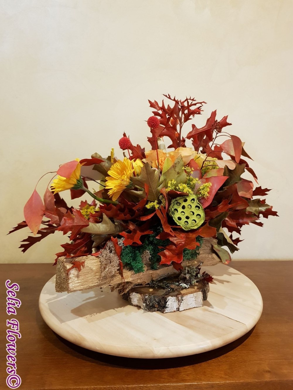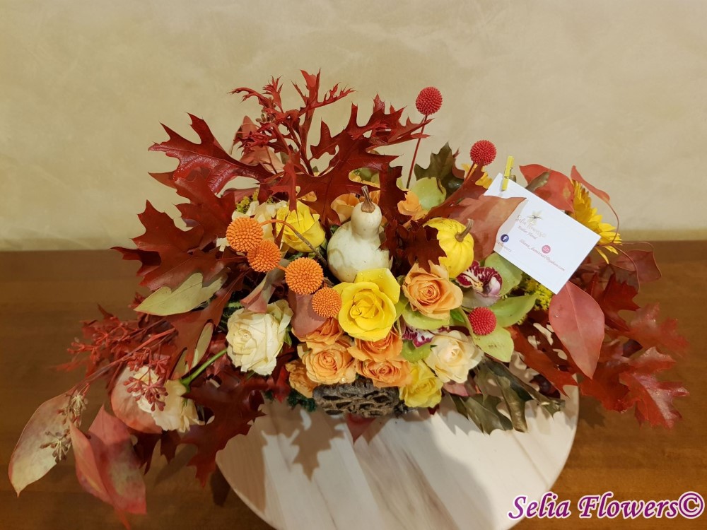 Compozitie: trandafiri, cupe de orhidee cymbidium, craspedia vopsita, eucalypt vopsit, germinis, flori de protea, frunze de artar, muschi si licheni stabilizati.