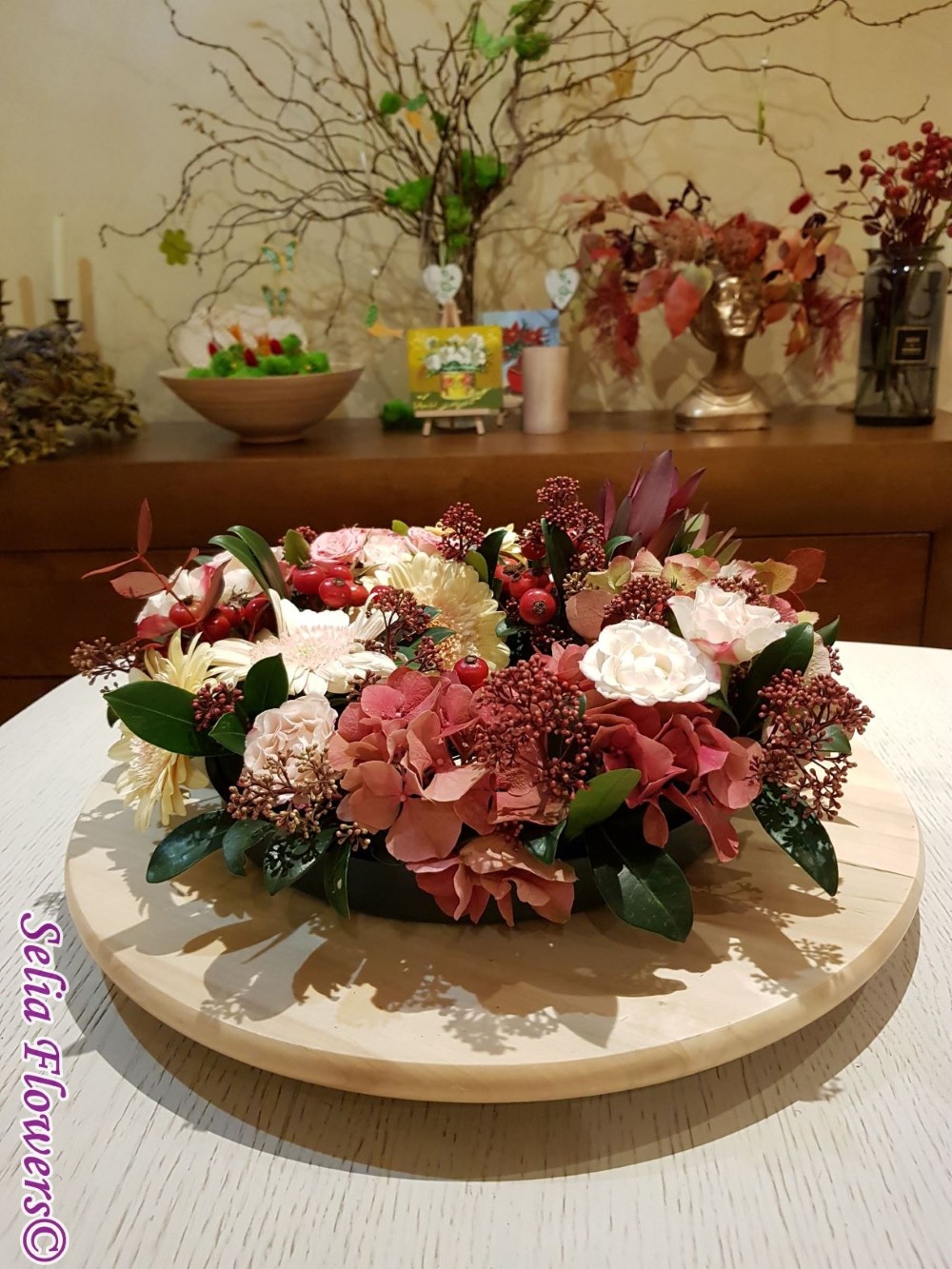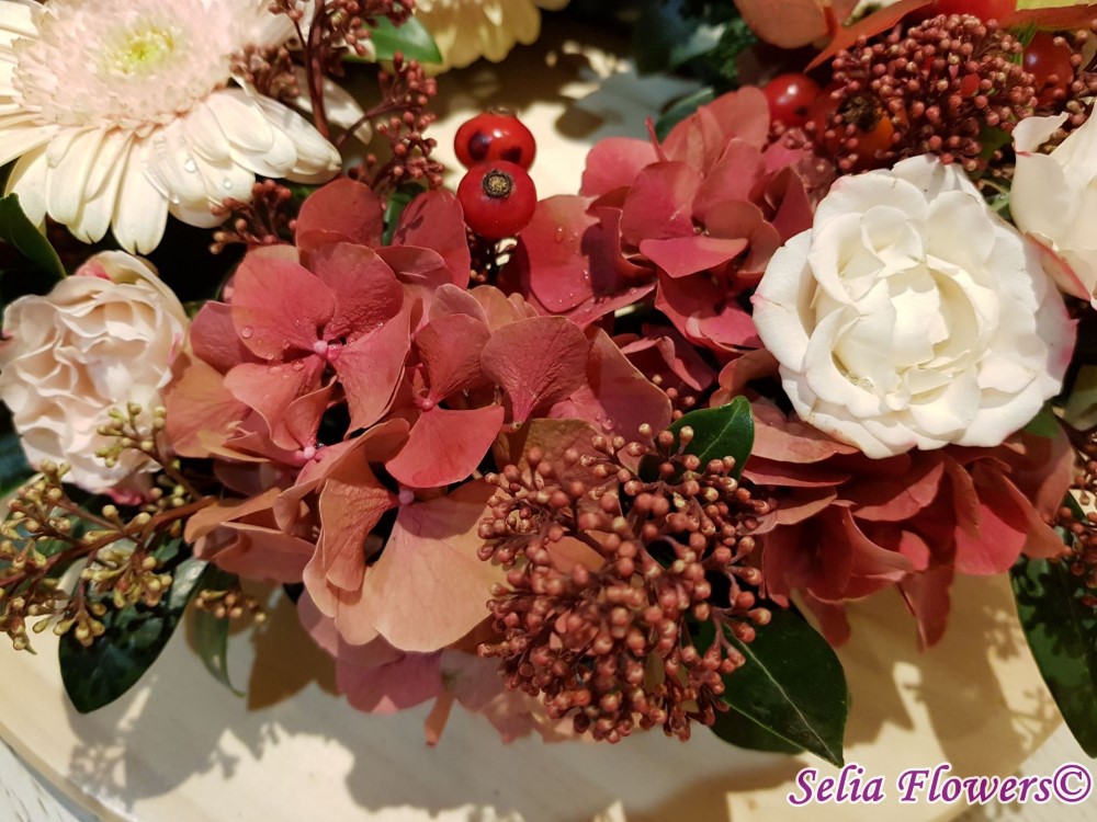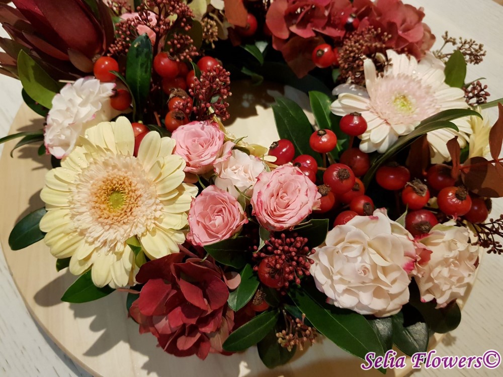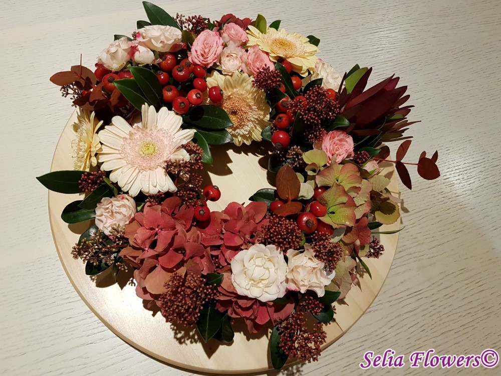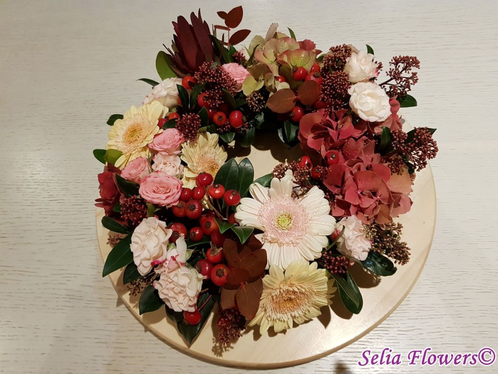 Coronita de toamna decorata cu flori naturale: hydrangea in doua culori, germinis, macese, trandafiri tros, leucadendron, skimmia, eucalypt. Baza coronitei este un inel prevazut cu burete floral umed cu un diametru initial de 25 cm (la livrare aproximativ 30-35 cm. Buretele floral asigura hidratarea florilor si mentinerea lor pentru o perioada mai indelungata.