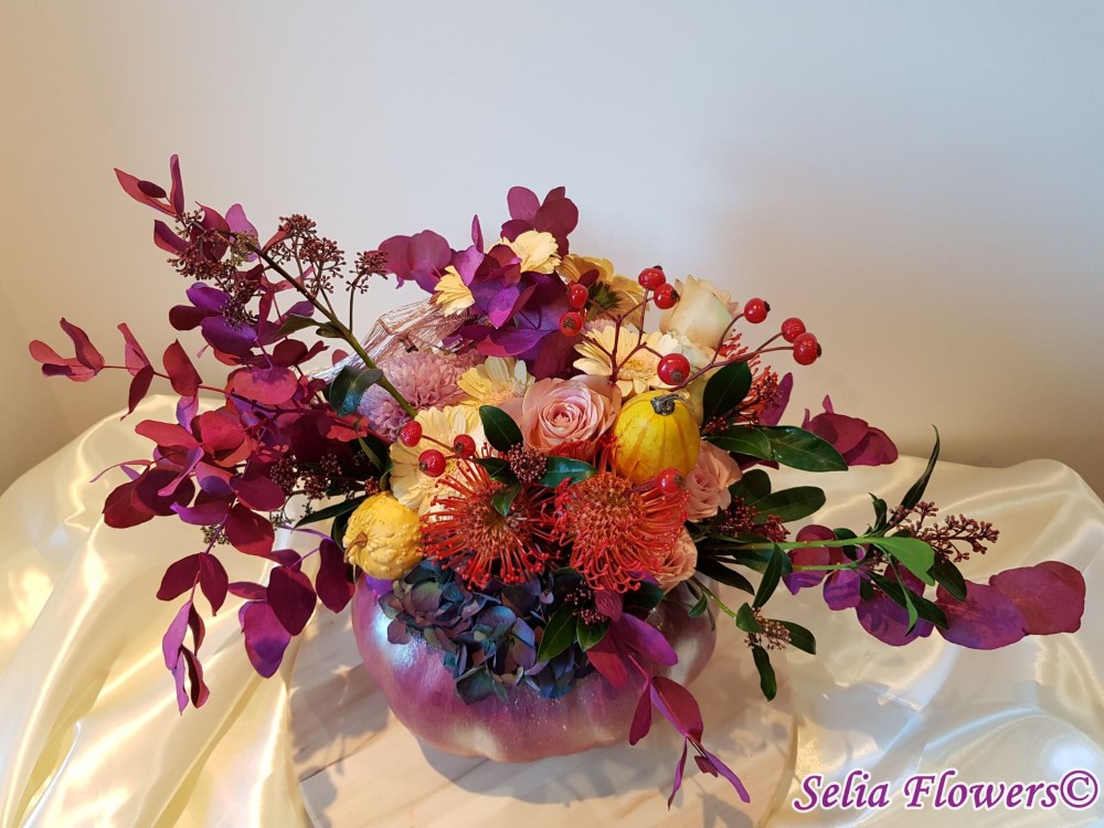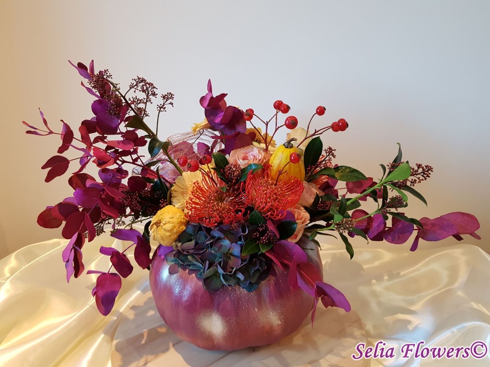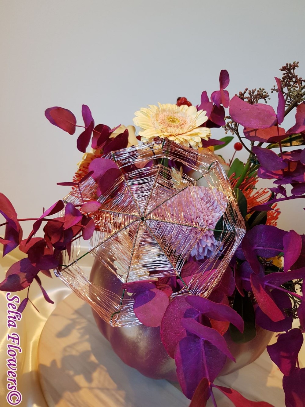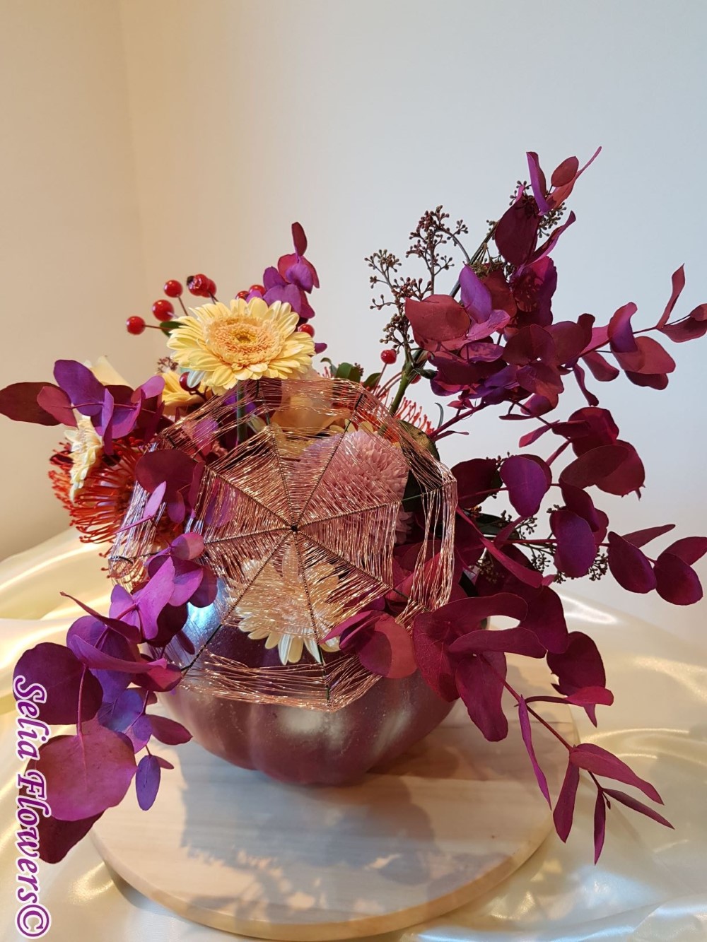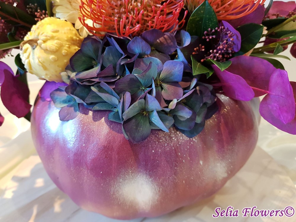 Un dovleac vopsit in doua culori, decorat cu flori naturale si minidovlecei, cu capac realizat cu ajutotul tehnicii spider web.