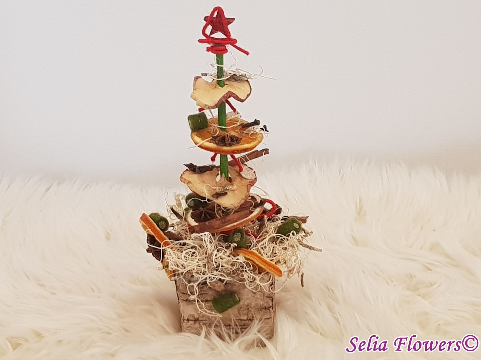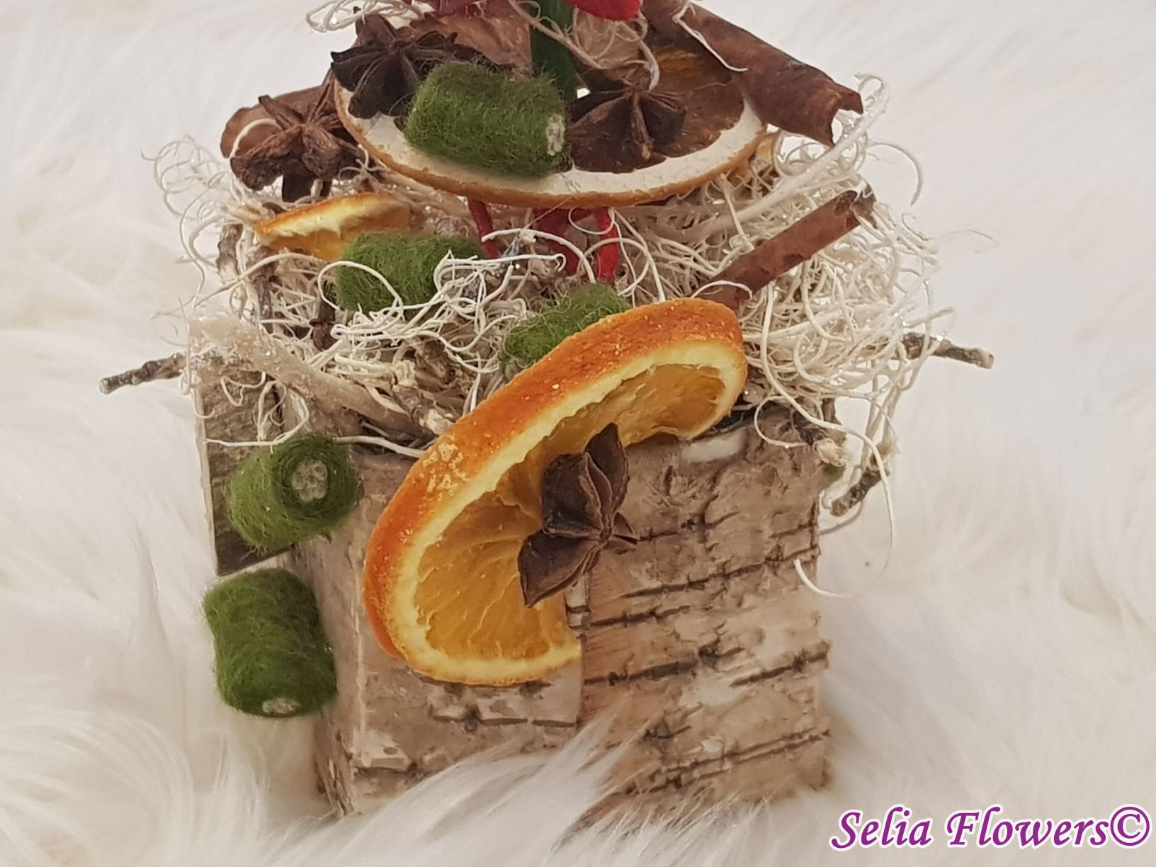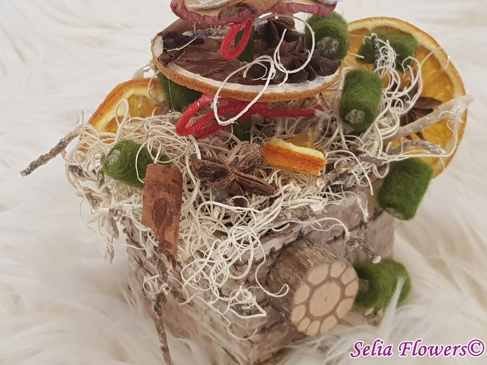 Un bradut cu miresme de Craciun, un aranjament unicat construit in cub de mesteacan cu latura de 7cm, din felii de fructe deshidratate (grapefruit, portocala, lamaie, mar). Este decorat cu elemente decorative aromatice (scortisoara, anason, cuisoare), muschi uscat cret de culoare alba, accesorii din lana. Inaltimea aranjamentului este de 27 cm, din care 20 cm este cea a bradutului construit.