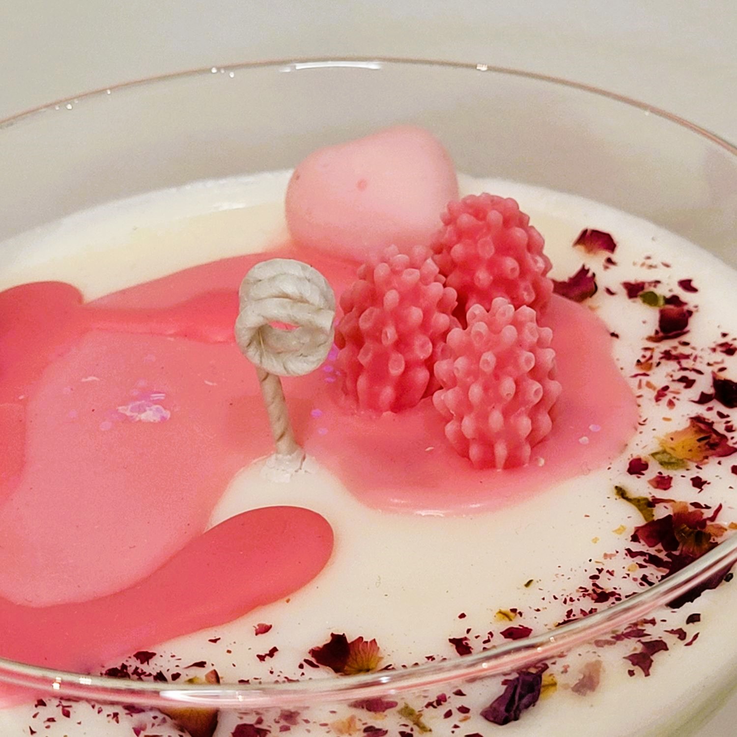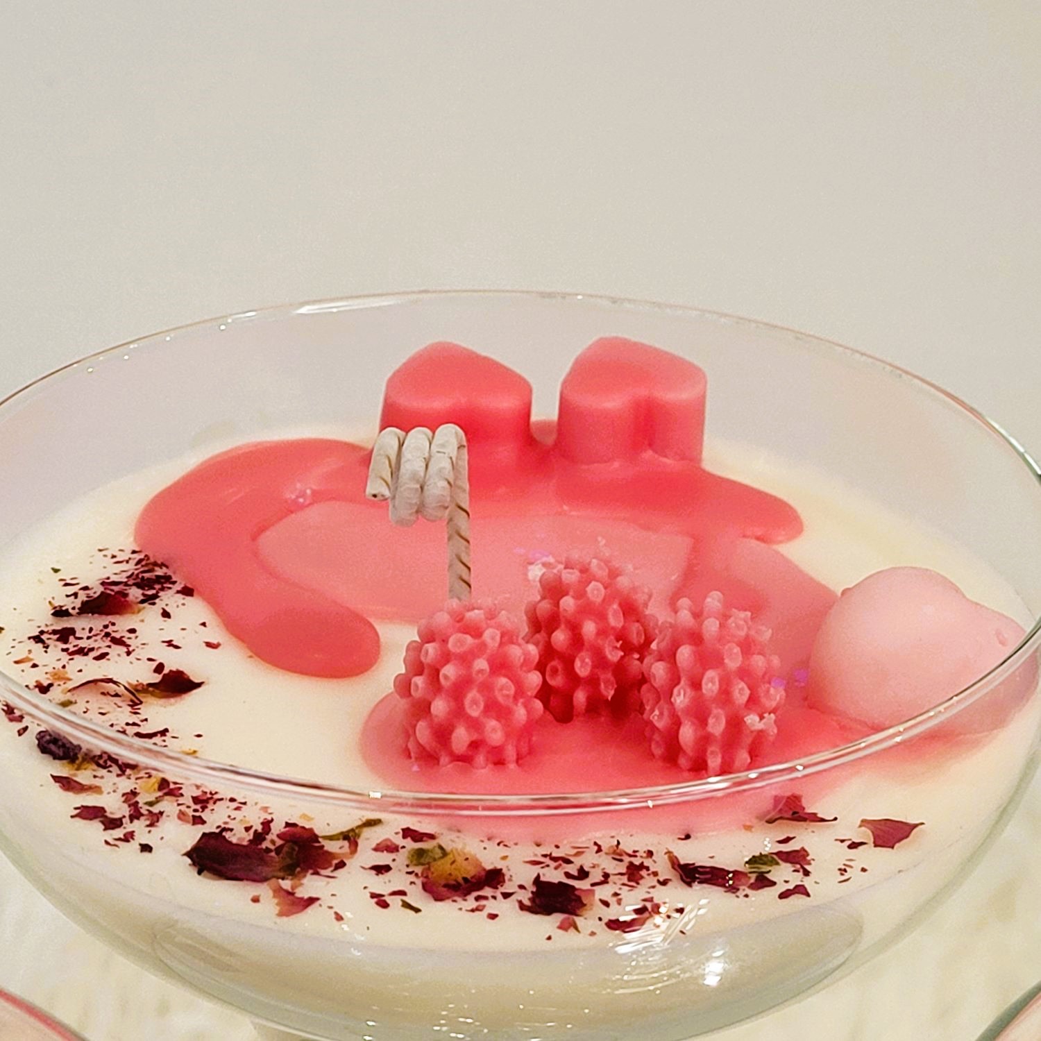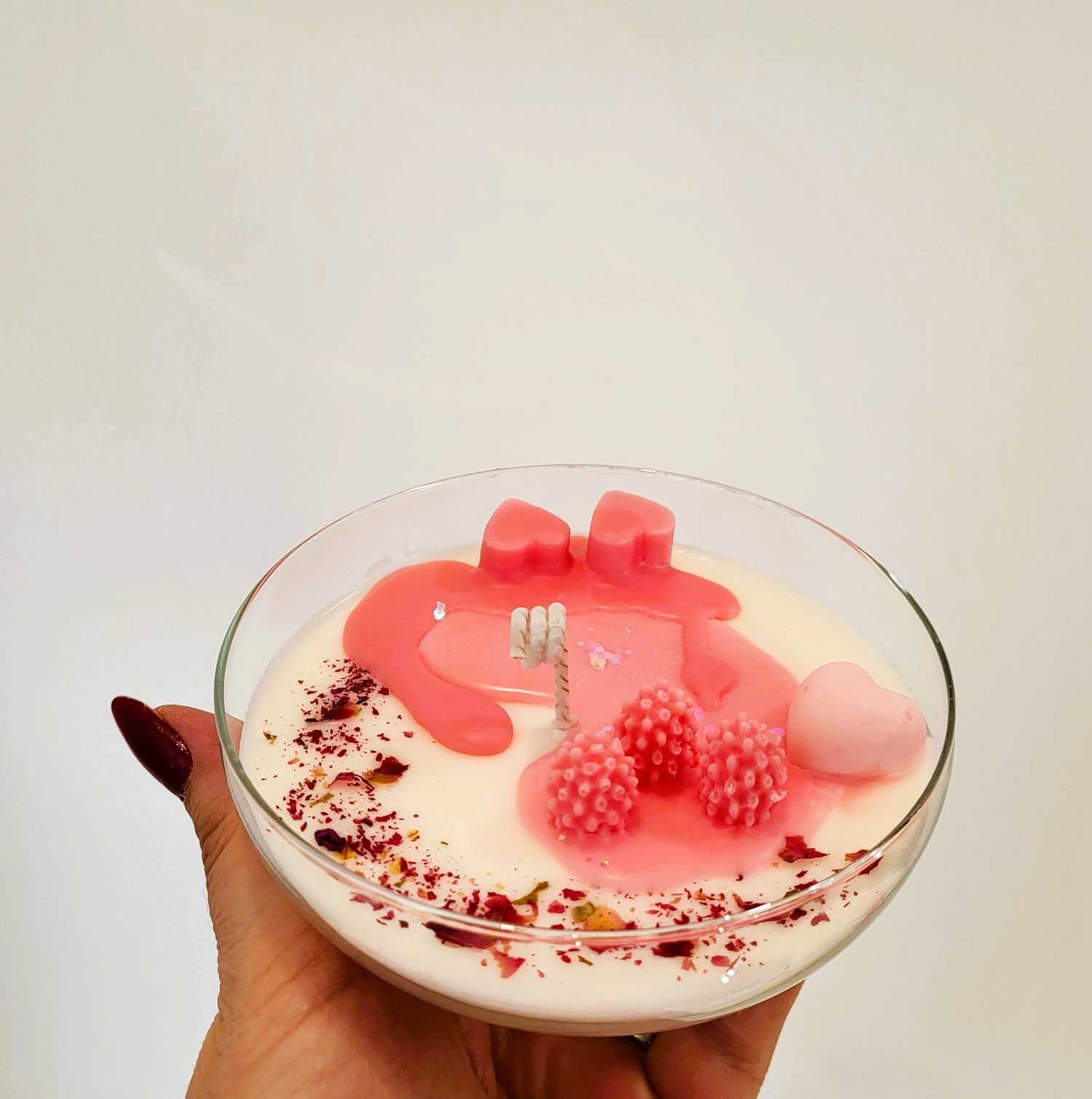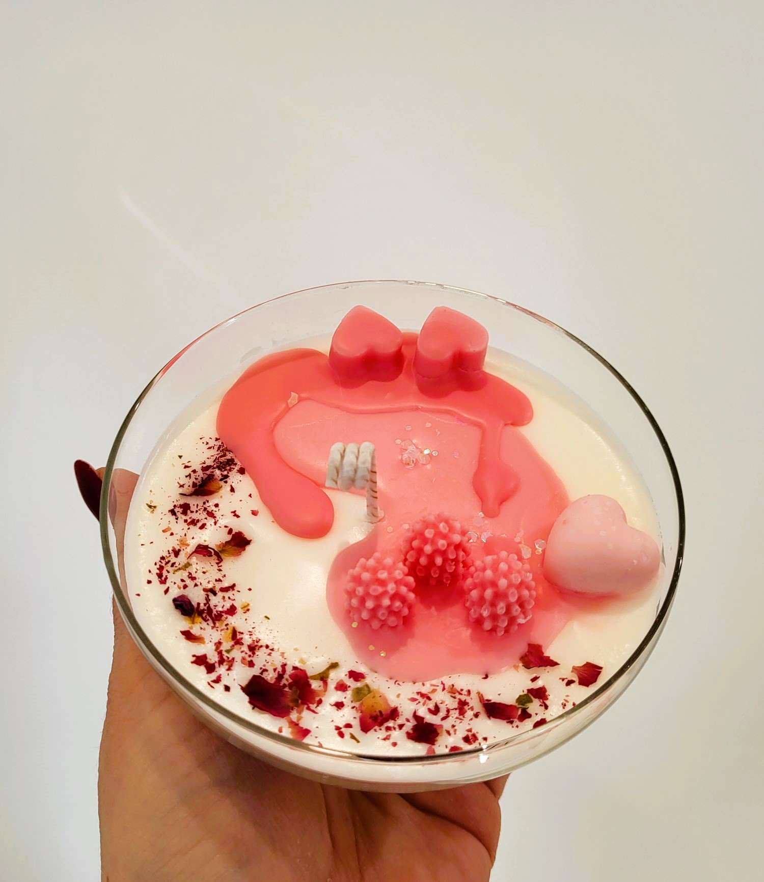 Pentru o persoană specială, un dar pe măsură! O cupă de șampanie; roz, cu multe inimioare, petale de trandafir și frăguțe. Alături de mix-ul de arome - Velvet Rose&Yasmine, Roasted Coffee și Spring floral – devine o experiență de neuitat. Greutate, 285 g.