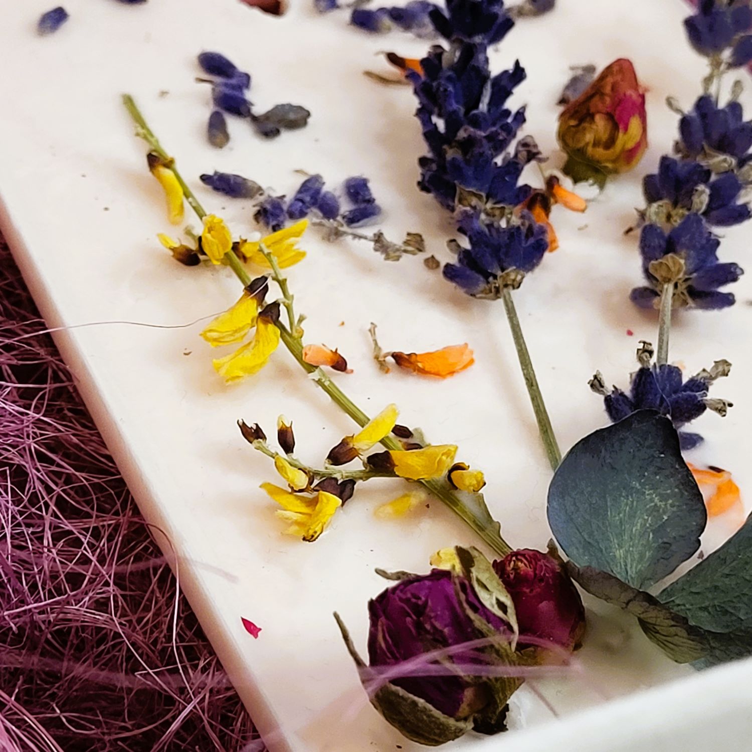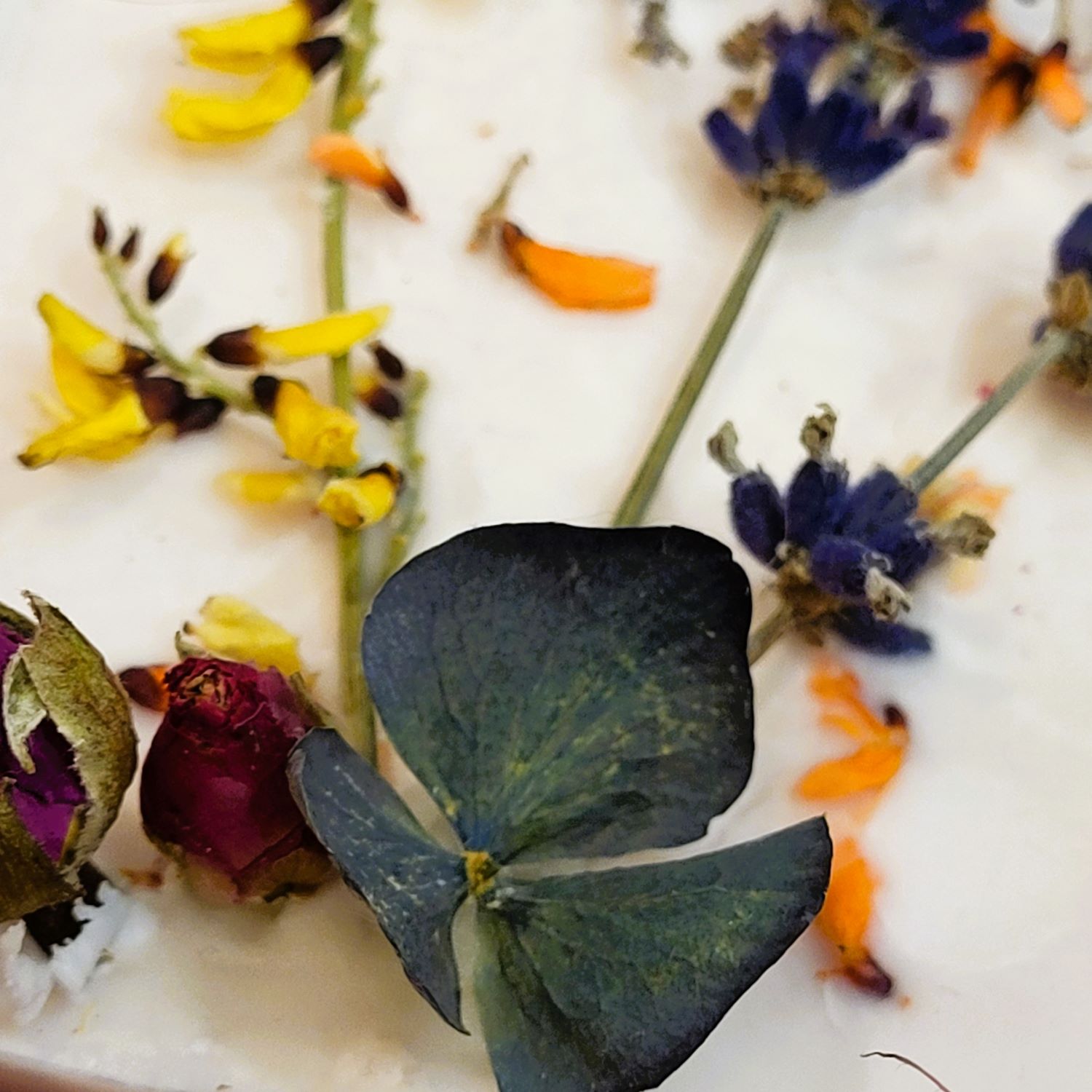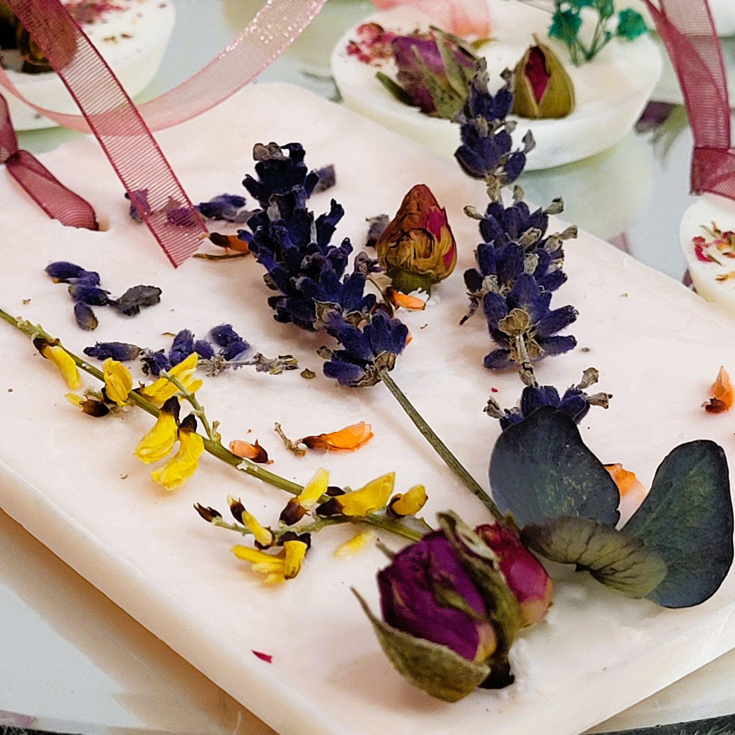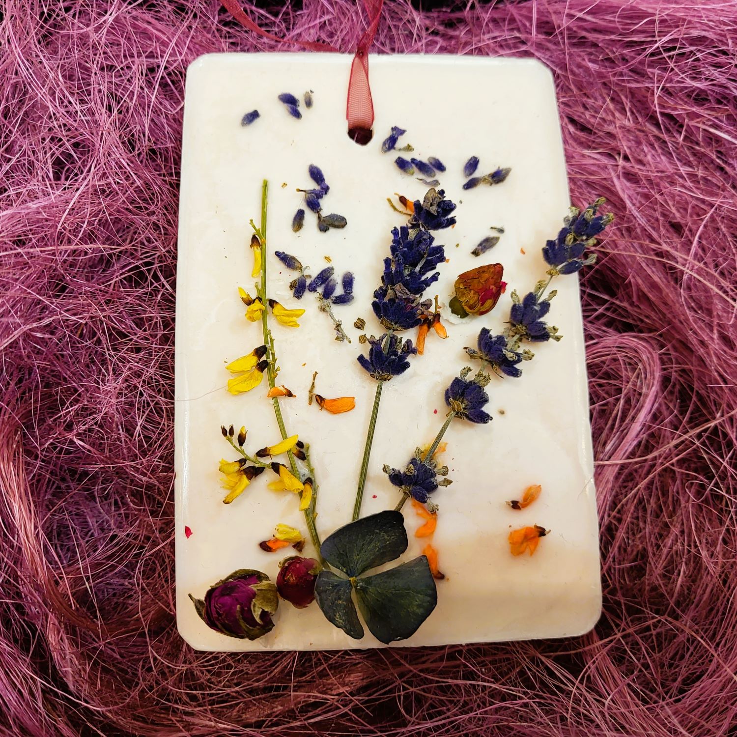 Tableta este turnată manual din ceară de soia de calitate premium. Este parfumată cu  uleiuri pure organice de vanilie, iasomie și spring floral și este decorată cu flori de hortensie, boboci de trandafir și  flori de genista. Are o greutate de aproximativ 50 gr. Dimensiuni: 13/8,5 cm.